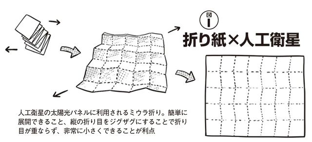 1970年に東京大学の三浦公亮氏によって考案された「ミウラ折り」は、世界的に有名な技術である。大きな紙であっても小さく折り畳め、対角を引くことで簡単に展開できる折り方で、これを人工衛星の太陽光パネルに応用するわけだ。
