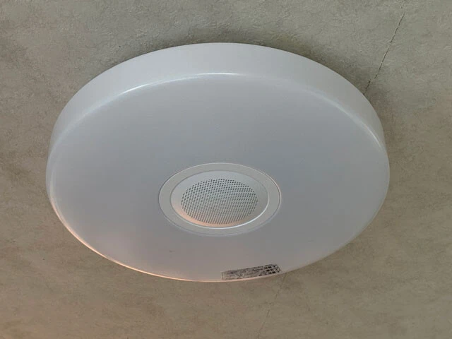 製品名のとおり、LEDシーリングライトにBluetoothスピーカーを内蔵。スマホと接続すれば天井のライトから音楽が流れる。大音量にはならないが、日常BGMとしては十分。5500円