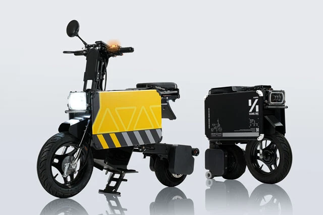 危険物のガソリンで動く車両と違い、建物の中に安心して入れられる電動ビークルの強みを最大化した折り畳み式バイク。盗難や雨ざらしの不安よさらば! 非常用電源としての利用も。49万8000円
