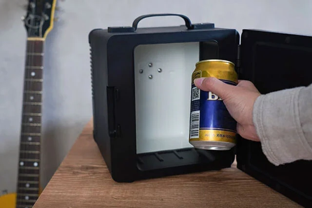 見た目はインテリアにもなるレトロなギターアンプ。その実体はスピーカー(有線接続)を搭載したペルチェ式小型冷蔵庫。350ml缶なら6本収納可能。車載シガーソケット給電にも対応。8980円