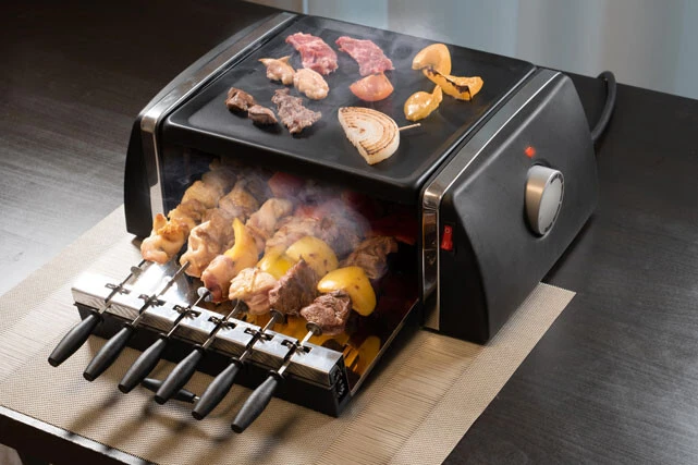 上段(ホットプレート)で焼き肉、下段(グリル)で焼き鳥を同時調理! しかもグリルは自動回転式なので、上段で肉や野菜を焼くことに集中できる。デカすぎないコンパクトボディも◎。6000円