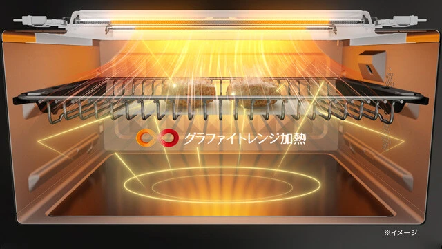 パンをモチモチに焼き上げるリベイクトースターが人気の同社初となるオーブンレンジが登場。0.2秒で瞬間発熱する「グラファイトヒータ」を採用したことで、これまで以上に中はモチモチ、さらに表面はサクサク。