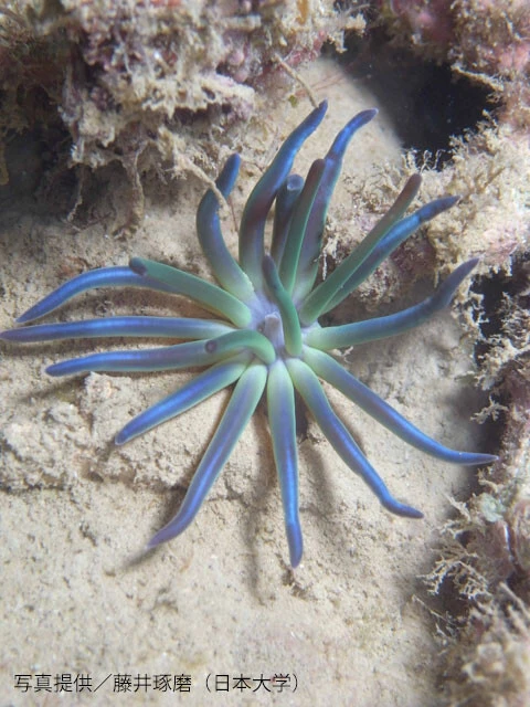 一見、サファイアムシモドキギンチャクの色違いみたいんなんだけど、DNAや体の構造はけっこう違う。浅い海にいるけど、砂に潜ってる時間が長いから派手な割に知られていないんだ。