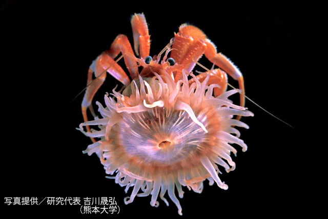 見てのとおり、ヤドカリと共生してるイソギンチャク。発見したチームには俺も参加し、研究に協力していた。ヤドカリと共生するイソギンチャクはほかにもいるんだけど、こいつは自分の分泌物で殻を増築できちゃう変なヤツなのよ。