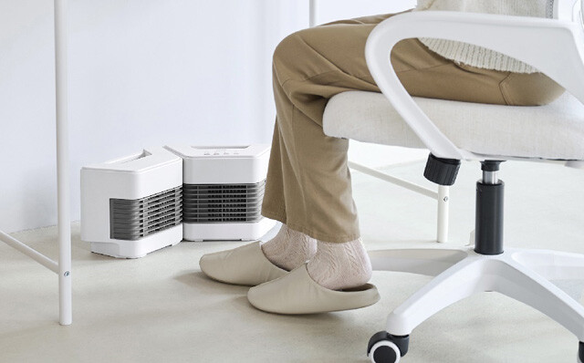 開閉式の本体なので、1台で2方向へ送風できるファンヒーター。対面する人物の足元をピンポイント暖房、ふたりがけのソファでもワイドに送風、デスク下に設置して爪先を保温......など使い方は自由自在!