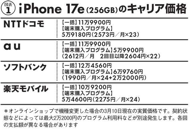 iPhone 17e(Apple/各9万9800円[256GB]~)。昨年のモデル16eのデザイン、6.1インチディスプレーを踏襲しつつ、チップセットは最新のA19チップを搭載。何より価格据え置きでス...